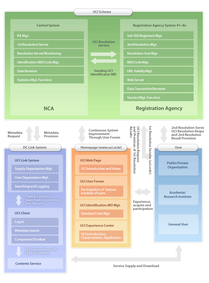 UCI system consists of a central system, registration and management system and digital contents link system. The Central system is in charge of registration agency, identification metadata and 1st resolution service. The registration and management system takes care of sub registration agency, registrant management, metadata management and 2nd resolution service (Including 3rd resolution service). The digital contents link system (Hereinafter UCL) supports reference and possible linkage between digital contents through UCI link by providing search function of the digital contents registered through UCL Client. The overall system architecture is as follows