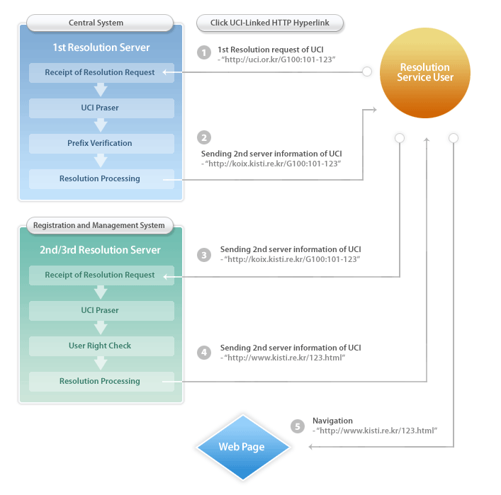- The client that receives 2nd resolution server to conduct UCI resolution is automatically connected to the 2nd resolution server by redirection. The 2nd resolution server receives 2nd resolution value through the Web server.