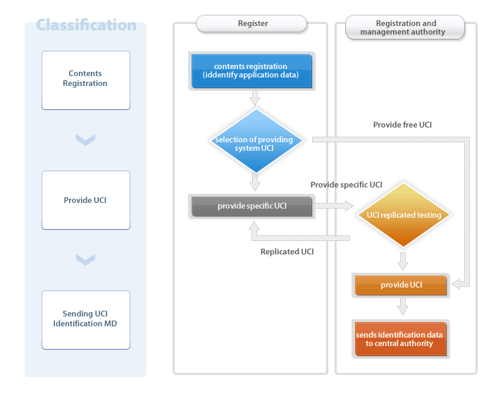 The operation management of UCI consists of a registration authority taking care of overall UCI operation, a registration agency receiving contents registration and providing UCI and a registrant registering contents information. The registration authority can have multiple registration agencies by field, organization and region. The registration agency can have multiple sub-registration agencies and registrants, as necessary.